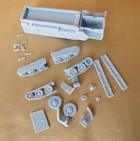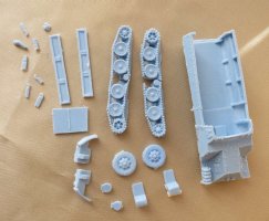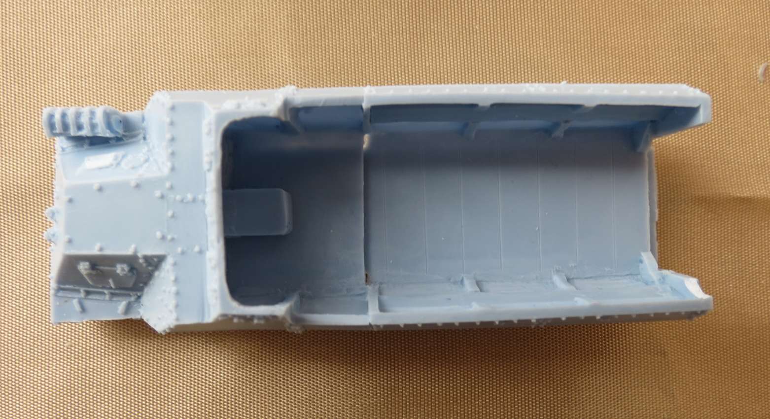 The hull is cast in one part. The engine compartment is hollow and there is no drive train.