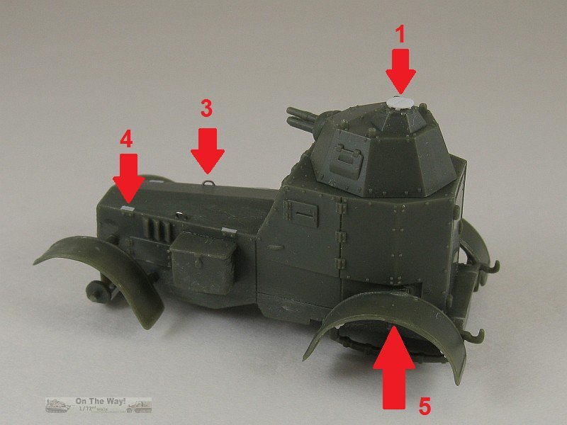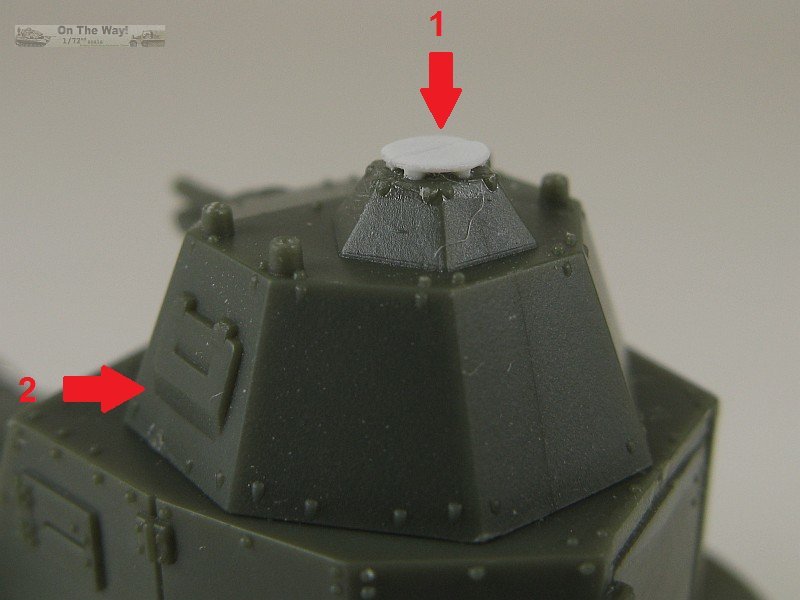 - (Red 2) The lower edge of both of the turret's side hatches are sloped: cut away the excess plastic.