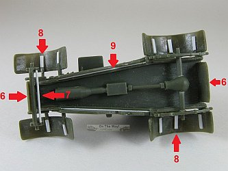 - (Red 8) Just for the fun of it, I tried adding fender supports to the underside of each fender. These are U-shaped channels made from scraping a groove down a thin