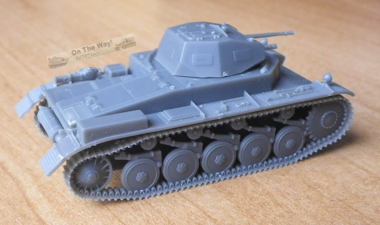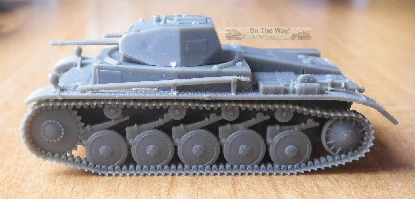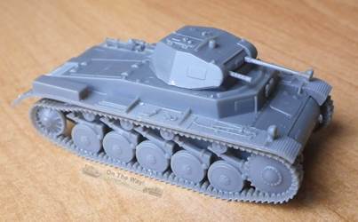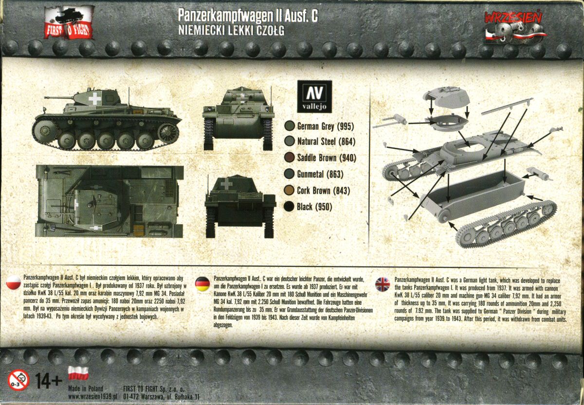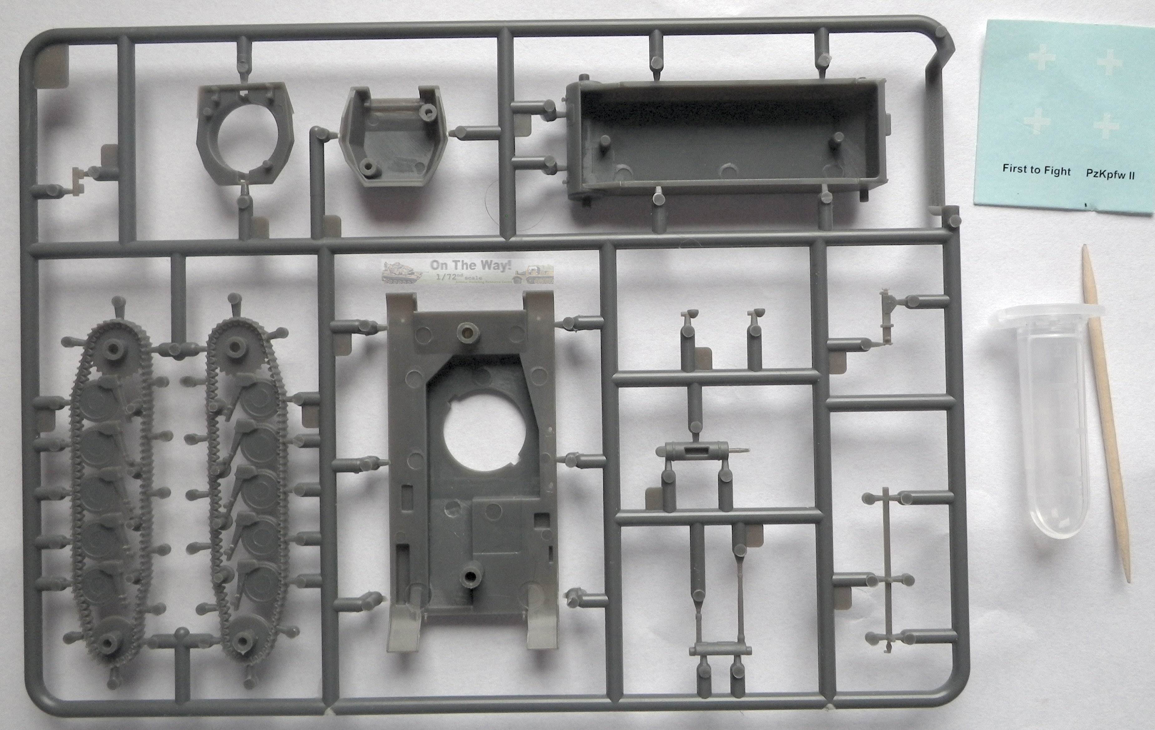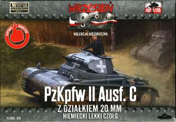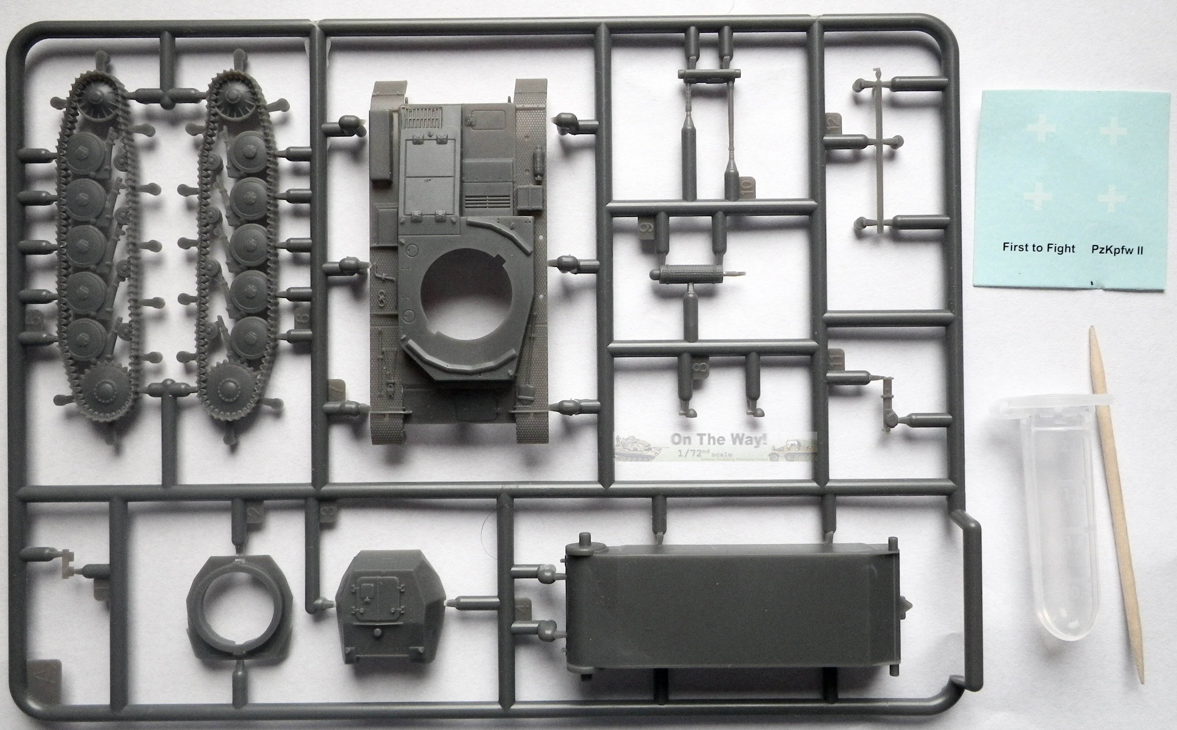| Overview As far as I know, the First to Fight kit, released in 2014, is the first plastic model of an early PzKpfw II Ausf C, with the rounded hull's front without extra armour. (Ed.note.: In fact, Attack has this version in their range as well.) Practically identical were earlier models: Ausf c (small letter), A and B, constituting a family of so-called 'standard' PzKfw II tanks. Only after hard lessons from the Polish campaign, PzKpfw II were fitted with extra armour on the nose, giving it an angular look. Therefore, the model represents the most typical German tank from the 1939 Polish campaign. Such tanks also still constituted some 30% of the PzKpfw II fleet during the French campaign. The kit contains one sprue, with only 13 parts, a bottle of a smelly glue and a decal sheet (not counting a toothpick for the glue). A basic assembly instruction is on the back side of the box, which is sufficient for this build. It also comes with a booklet (actually the kit is a "bonus" to the periodical booklet) which is in Polish only. On the box you'll find a painting scheme with the corresponding Vallejo paint call outs, also repeated in the booklet The model is a quick build kit, similar in appearance, design and detail level to the late PzKpfw II C manufactured by S-Model. In fact, the similarity of the moulding quality of these two kits is striking. Both have tools finely moulded on the fenders, which also have a delicate pattern. All the parts are very sharp and highly detailed for a quick build kit. Separate parts are: a jack, headlights, an antenna trough, and, contrary to S-Model, a driver's visor. On my sample there were no sinkholes or flash. All the ejector marks were on the inside of the parts and not in visible places. Overall the moulding quality is very good and details are delicate. |