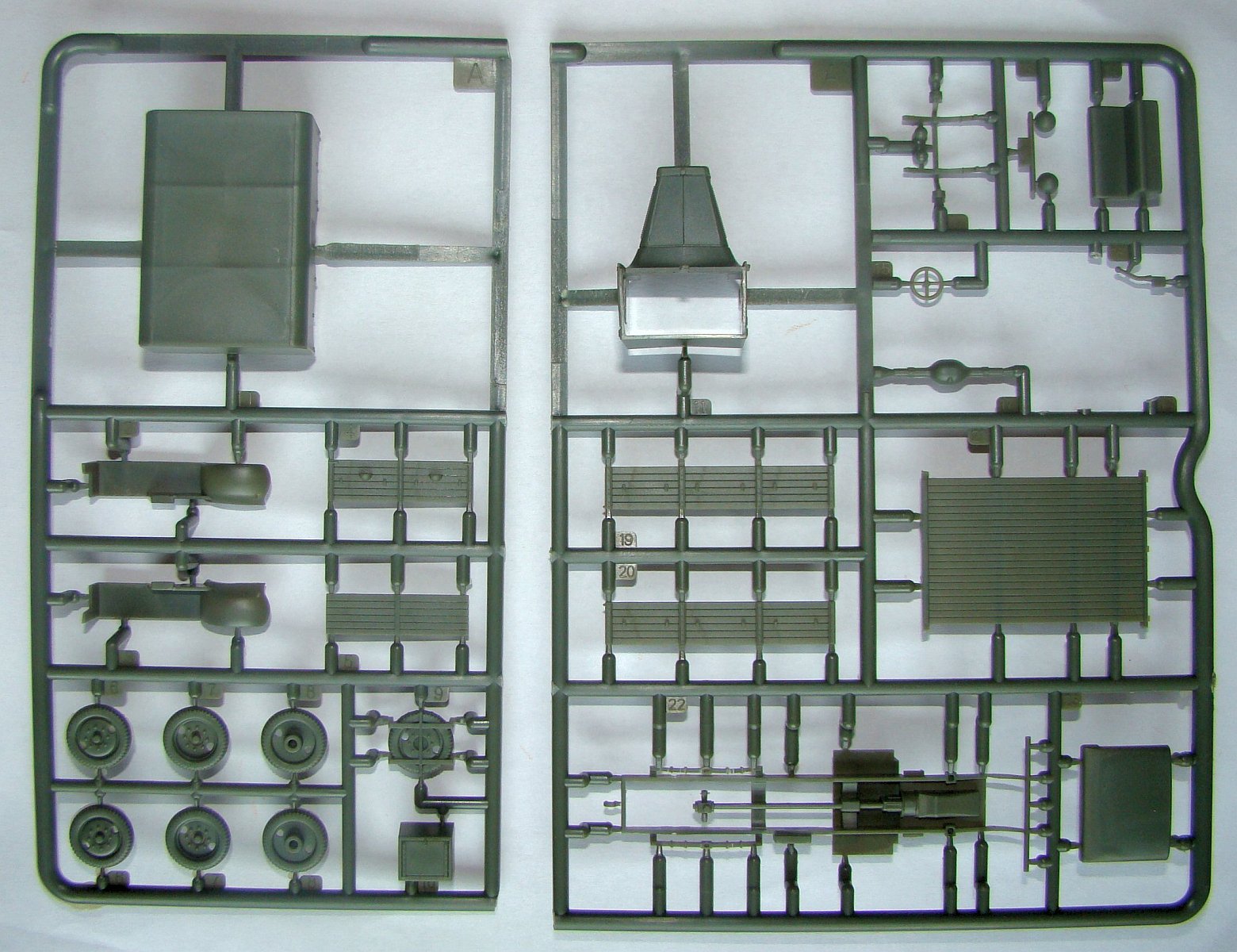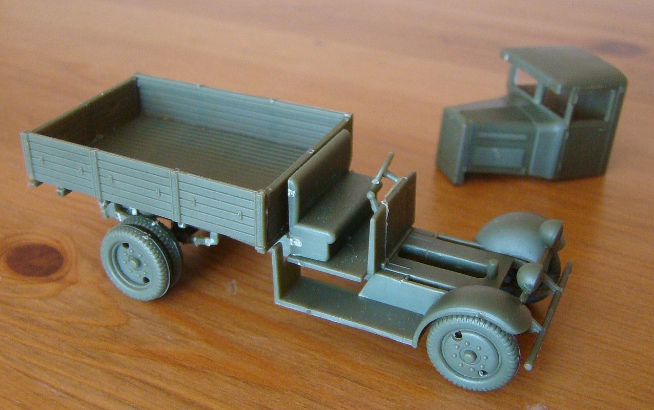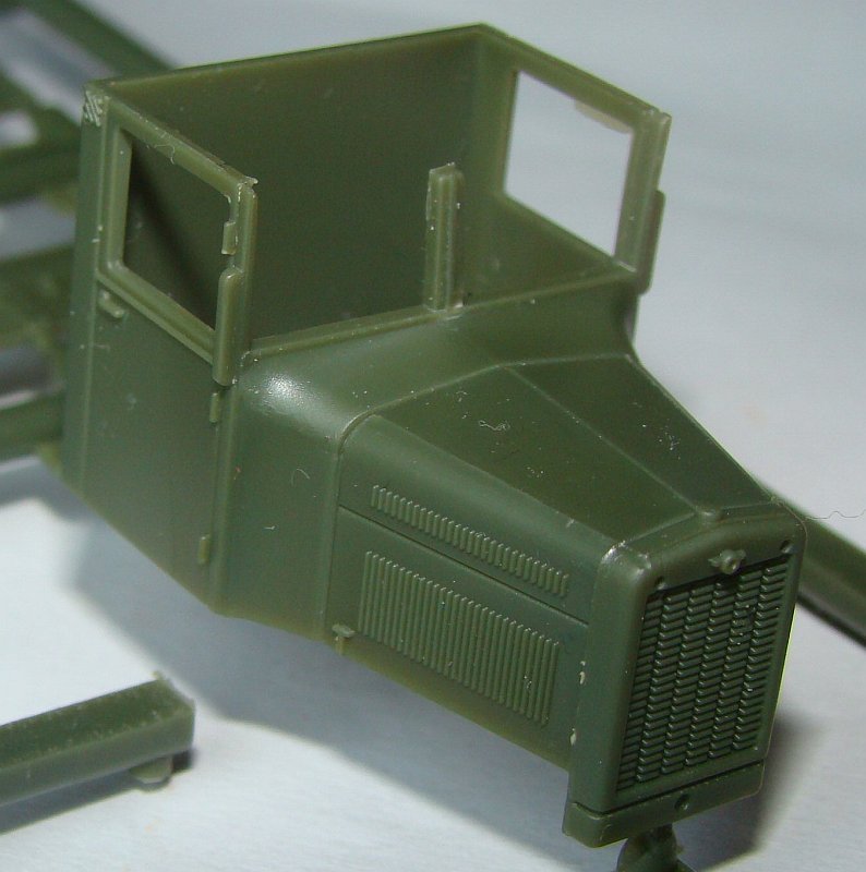 The plastic is quite soft and easy to work with, however the parts will have cut marks which should be sanded out and painted, especially on the tubular fender. There is no problem with parts fit. There are several ejector marks on underside of side steps and platform. The truck can be built with an open cargo platform or with a canvas top which is closed at the end and comes as a single part. The box's rear wall can be assembled open.