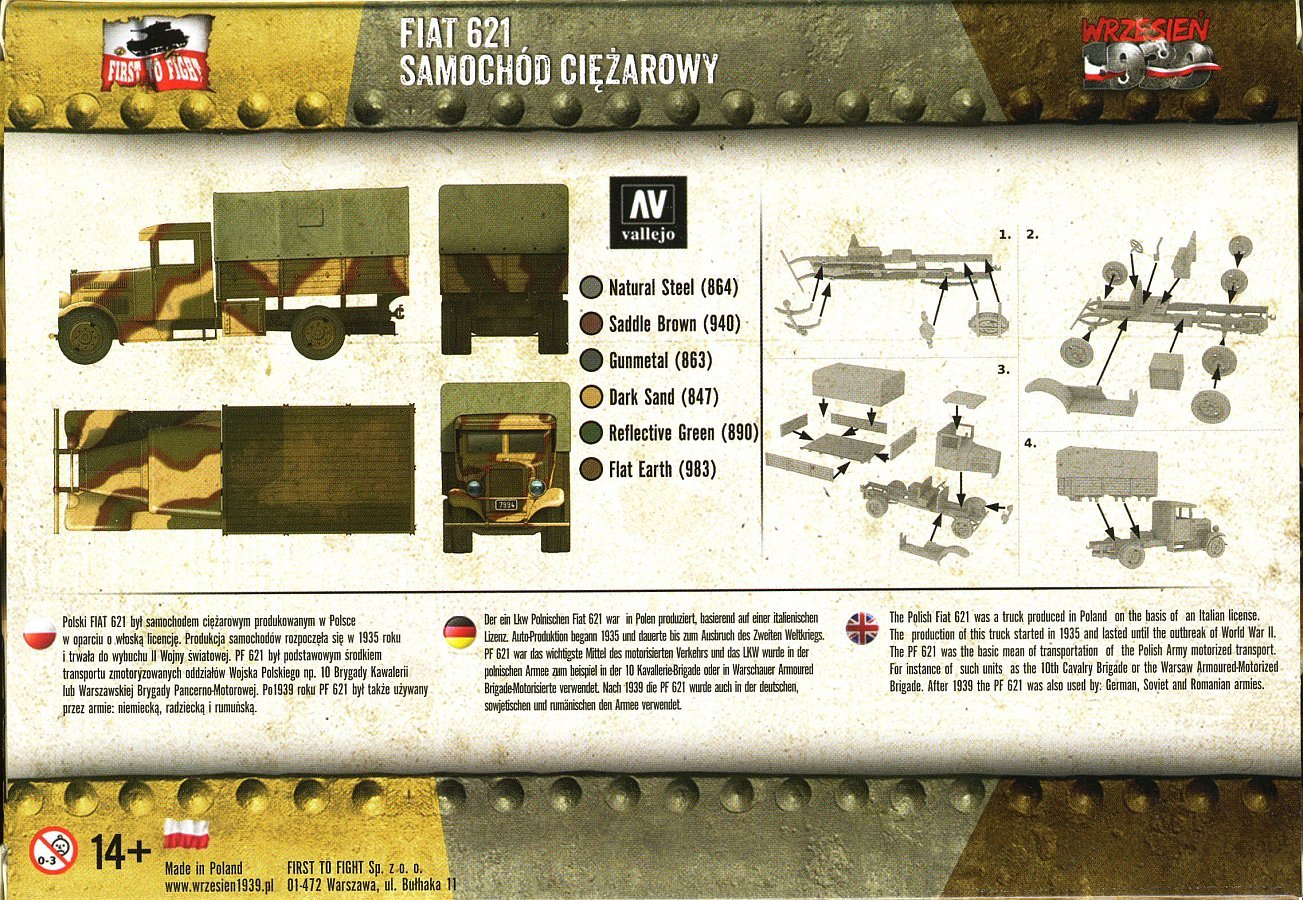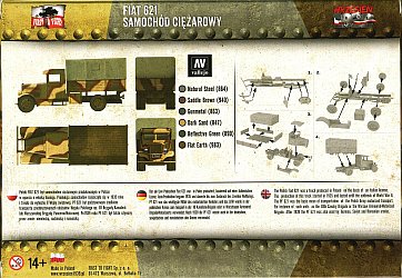 Although described simply as a FIAT 621, this is actually the Polish licence-built Polski Fiat 621L (PF 621L) 2.5-ton 4x2 truck, which was the most common truck in the Polish Army in 1939. The kit presents a main (mid) production variant with an old-style cab with ventilation grates behind the doors, and short side steps. This kit, released in 2014, is the first injection model of this vehicle which up to now was only available as a resin model by MarS which is over 15 years older (an article on the MarS kit can be read here).