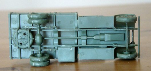 The chassis of the model is simplified, but there is no documentation available. There are nicely molded leaf springs, front axle, lower part of the engine and a drive shaft. The connection of the drive shaft with the rear axle however looks very suspicious and unusual, and is different, than in the MarS kit. The latter has an ordinary slanted drive shaft, joined directly to the differential, which seems more probable. Also missing is a muffler, which should be on the right side. Wheels are nicely molded, have a correct size and look, except for rear wheel hubs, which are somehow too shallow, but they are acceptable in my opinion.