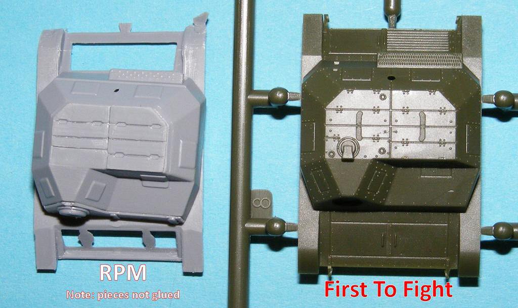 | On the picture left, you see a comparison between the First to Fight hull and the RPM one (courtesy of Jeff Hamblen). Clearly the FtF upper hull has more and sharper detail. | |