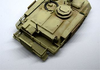 Not much to be said in Step 2, just follow the instructions. Some care with positioning the 7 screens for the rear engine deck (I must observe that this is one of the points where this Flyhawk kit surpasses any other M1 Abrams kits), a really nice touch because they are very finely designed and go into place rather easily; the inner of the 2 left screens must be placed on a sloped surface, so it must be bent accordingly. Other PE parts for the upper deck include the bar for the front fenders and the grab handle on the left side. The side skirts can be assembled now or left off and glued later after having installed the track assembly.