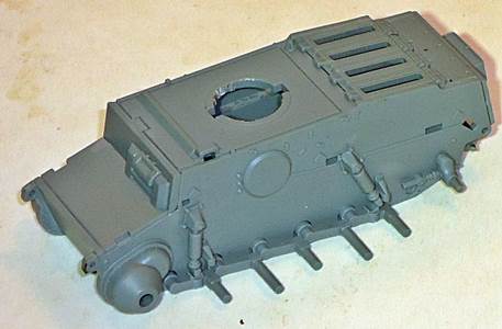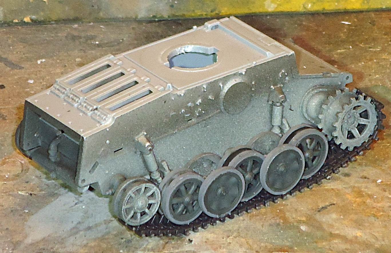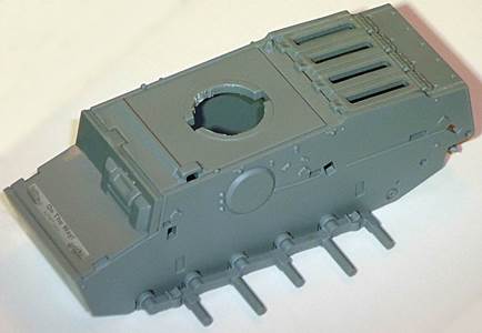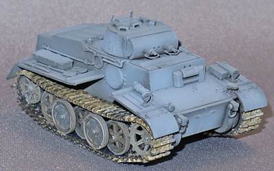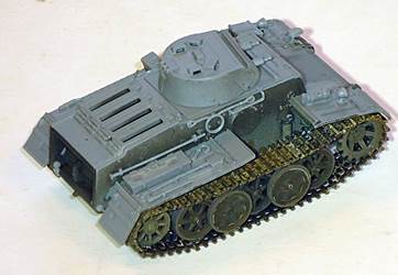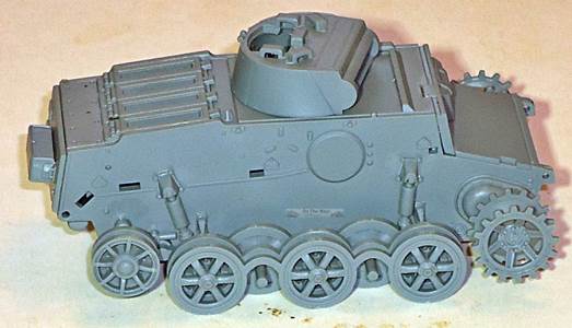 As it will be difficult to paint the area behind the roadwheels once the tracks are in place, I painted this area first after having decided to go for the dark gray painting option. As mentioned earlier, the roadwheels are given in the "neo-classical way", being connected by arcs. Up till now, all manufacturers that have chosen this approach have presented their roadwheels in exactly the same position, which doesn't look entirely realistic. I therefore decided to sever them and install them individually, taking care that pairs of roadwheel halves are aligned. The fit of the wheels on the axles is so tight that it doesn't pose a problem to keep them in line while adding realism. The tracks have a level of detail that I haven't seen in any other kit. Track faces are very crisp, track teeth are hollow (!) and individual tracks pins are represented. The individual links actually click into these track pins. The fit of these is tight, so tight that working track links are starting to appear on the horizon of possibilities. Flash is nowhere to be found and as the tracks are given in dark gray (the rest of the kit is light gray) they will not require much painting, perhaps just some dry brushing and weathering. |