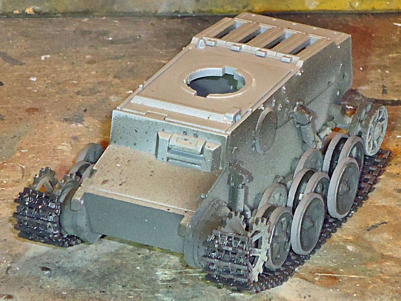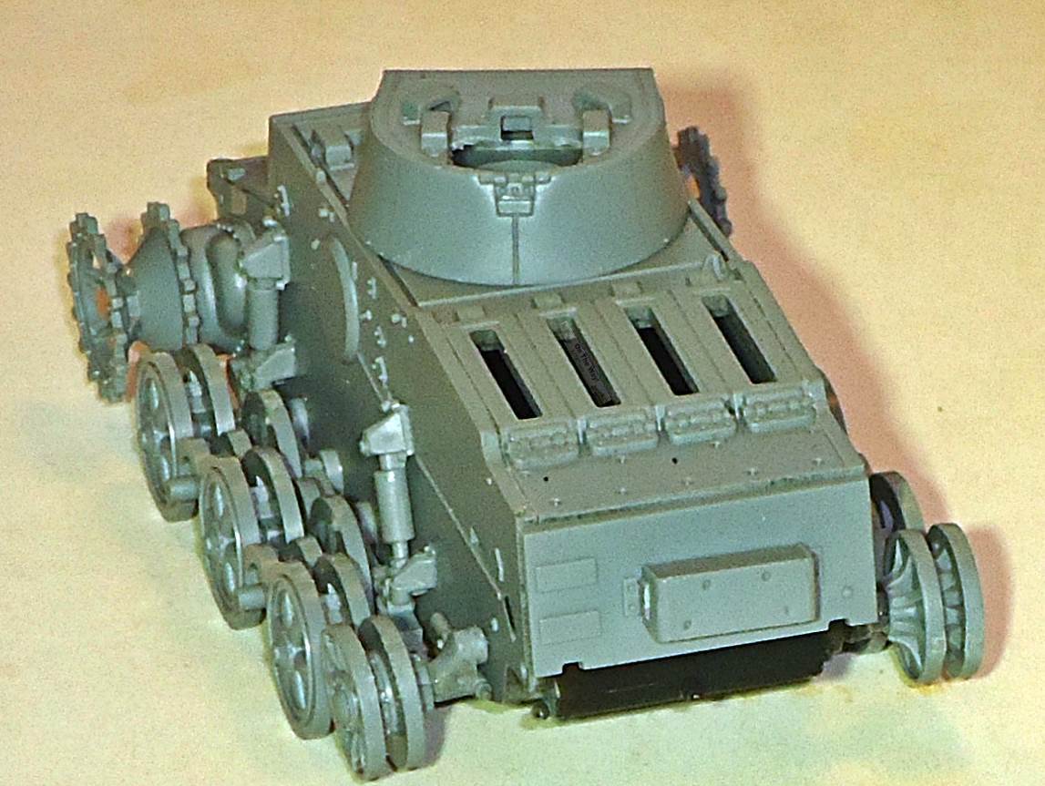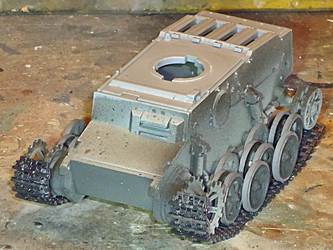 although a little surgery will be in order. At this point a single sink hole was found in the idler mount, which will be hidden by the tracks. I also discovered that the rear hull plate will stay in place without glue, allowing access to the exhaust. It is just an example of how well this kit goes together. In the pictures below I dry-fitted the roadwheels, sprocket, idler and turret. (The idlers are not perfectly aligned yet.) The interleaved suspension is done in the (by now) classical way of connecting a row of wheels with an arc that ensures perfect alignment. I again compared the look of the kit against pictures and plans in [1] and found no mistakes. Flyhawk even captured the slightly different layout of the bolts between the left and right drive sprocket. |