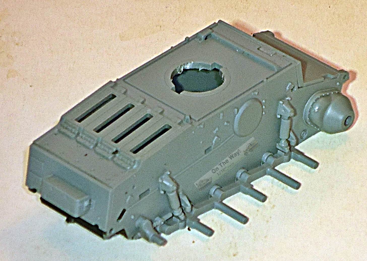 Construction So far I've finished step 1 of the construction sequence, and I must say the fit is perfect. The way the kit is engineered opens the way for anyone that would like to add an engine and I am wondering at this point if I should have painted the interior of the engine compartment, even though I don't think much will be visible after the meshes are added. The visor (part I-5) is installed, and the instructions are not very clear where to put it exactly. In fact, being a separate part, the modeler can choose to put it in the open or closed position. Closed is just as low as it can be placed; open would put the upper edge just below the centerline of the binocular sighting ports of the driver (see picture), meaning that it slightly overlaps these holes. The muffler is added to the rear, and I am not sure if the etched part for the shroud is an added value as I had difficulty bending it to (semi-) tubular shape. We will see how much is visible once the rear hull plate is in place. It would be a good idea to paint the area around the muffler black at this point, as it will be difficult to access this area once the hull is closed. At this point, I have let the plastic periscope cover above the driver in place, as I am afraid that the etched alternative part will be eaten by the carpet monster if installed too soon. Note that, if you choose not to use the etched part and want to install the vision block, now would be too late. It would be best to install this before mating the hull halves. At this point, I compared the basic dimensions against plans in [1], and if my measurements are anything to go by, then this kit is as close to 1/72 in all major dimensions as can be. (Note that in the picture on the right the roughness inside the turret ring is entirely my doing. It will be cleaned up later.) |