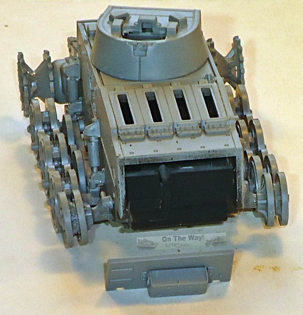 and found them all to be within measuring tolerance of 1/72. As with all tracked kits, getting closure is always a hit-and-miss affair. While the right track demanded an integer number of track links to get a around the whole suspension, I ended up with a rational number on the left side. I have no idea why this happened as both the left and right side seem to have the same dimensions. Severing the idler from its axle and moving it a quarter of a milimeter more to the rear allowed me to insert the last track link. Even with the two links needed as spare tracks on the rear hull, I still have 8 track links left. As a lot of manufacturers give just enough track links to have one too few, this comes as a relief. Actually, if Flyhawk, for some reason, would specialize in manufacturing tracks of this quality as separate sets, they might prove very popular. After the tracks were fitted, the fenders were put