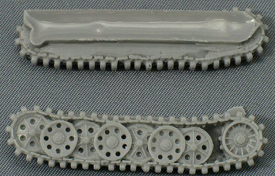 | The suspension and tracks are moulded in one big piece. However, detail is not always sharp and the space between the wheels and tracks has a number of visible resin imperfections. Additionally, the way the tracks lie on top of the wheels doesn't look correct to me... | |||