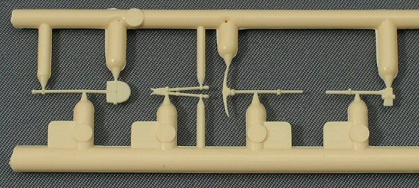 The small styrene sprue with tools is part of a bigger tool set, designed and produced by MACO (Set 72101). Being nicely moulded with sharp detail, this is a nice touch to include them. However, stowing away these (large) tools on such a small vehicle isn't straightforward. The instructions tell you to glue the pick axe on top of the fighting compartment, which seems a bit bizarre to me... | |||