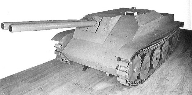 However, when the war ended, it only existed on the drawing board, but a full-size wooden mock-up had been build. If ever produced, that 3.55m long mini tank killer, having only a two man crew, would have packed a considerable punch with two 80mm Rheinmetall Panzerabwehr-Wurfkanone PAW-600 smooth-bore guns. These, for that time, very advanced recoilless guns were effectively test fired during the war and apparently had an armour penetration, out to its full effective anti-tank range of 750 meters, comparable to the 75mm PaK40, but at less than half the weight of that PaK40. Some more information on this vehicle can be found on this page : http://strangevehicles.greyfalcon.us/rutscher.htm Roughly