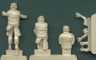 The sculpting is fantastic, and with the exception of a single air bubble marring one of the trooper's goggles, the casting is first rate as well. They are dressed with tanker's helmet, flak vest, microphones, and two of them have scarves over their faces, as in a desert environment (and one has his goggles lowered). The standing figure measures 26.5 mm tall with boots and headgear, so I guess about 25mm without, which makes him about 1.8 m, or 5'11" tall. I have some questions for those who may know: are there differences in the tanker's uniforms for the US Army and the US Marines? Could these figures be used for both? Can they be used in Bradleys and LAV-25s, or only Abrams? If anyone knows the answers to these questions, please let me know and I'll post the information here, because I'm sure others would like to know as well. Thanks. Thank you very much to Goffy Model for the providing the review item. |