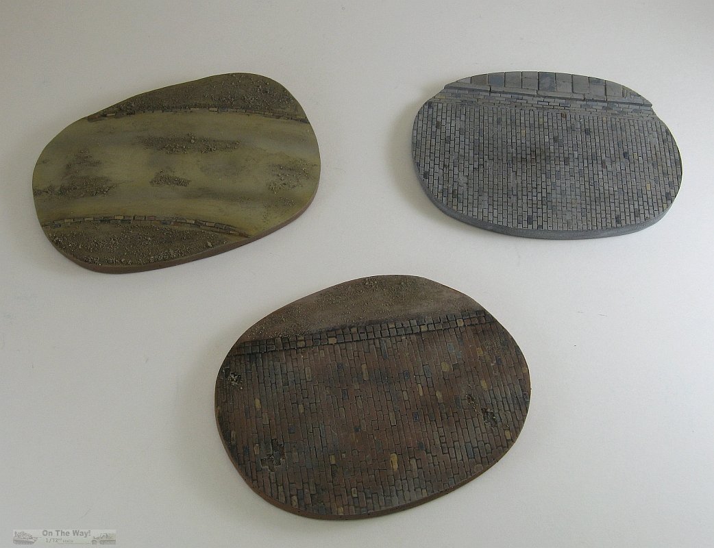 one side. It measures roughly 87.8mm by 67.5mm. The third base is a dirt road with a thin brick edging. It measures approx. 99mm by 66mm. As you can see their