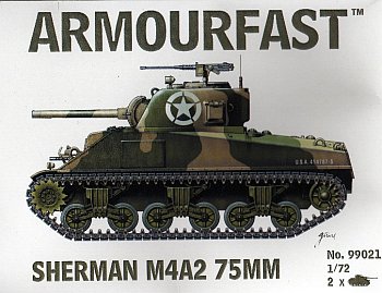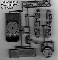 The Armourfast M4A2 75MM Sherman kit only consists of 13 pieces in dark green styrene. Altogether there is actually 26 total pieces because you get two Shermans per box. Armourfast's instructions are an exploded diagram format, printed directly on the back of the box. No decals are included in these kits as of yet.