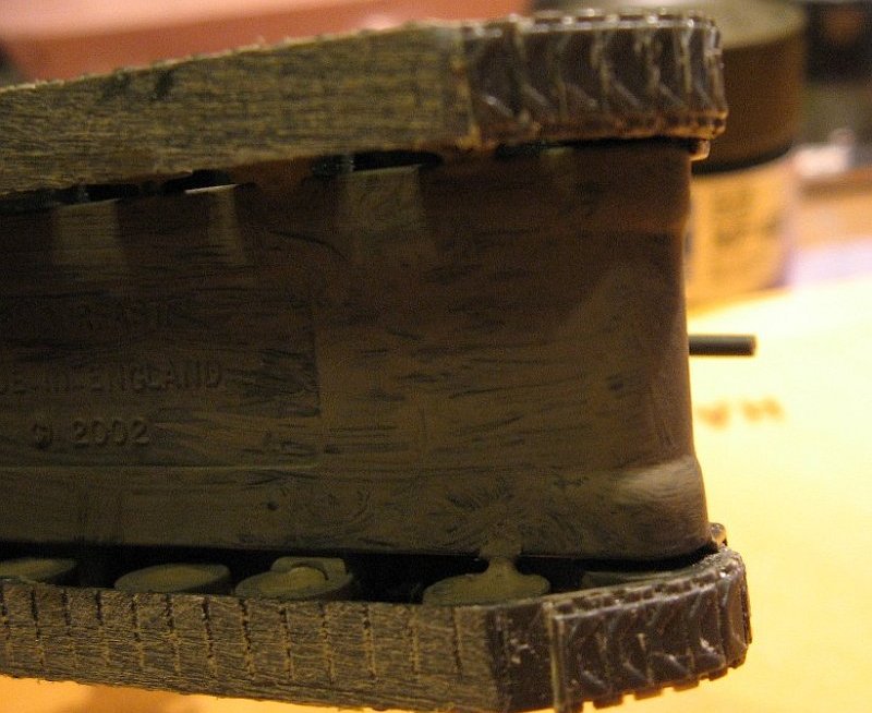 I decided to detail one of these "quick-build" type kits and added a few parts from my spares using some ESCI/Italeri link and length leftovers. I heavily sanded the bottom of the kit track to get what I thought was more of a scale thickness. This included sanding around the sprocket and idler wheel runs. I clipped off the track teeth and sanded, then scored the track runs to bend and glue around the visible front and rear areas of the track runs. When the track wouldn't bend, I used individual links. This took the most of the work needed to do the detailing. I used photo-etched light guards left over from a Dragon kit, made my own lift hooks on the turret, and that was really about all.