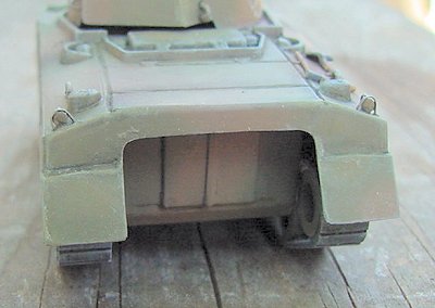 As a wargaming piece, this is a perfectly suitable and well made model. From the perspective of building a static display model, the main weak areas of the kit are the tracks and the rear hull. The tracks are over-simplified; they have very weak shoe detail, and no guide teeth. The inside of the track is perfectly smooth. This was done because of the way the track and wheel assemblies were molded as a single piece. It's not that big of a deal, but if you want to improve it, it would be easy to substitute the wheels and track from an ESCI kit. The sprocket wheels are molded solid, and I had planned on taking a motortool to them to separate the rear sides into two sprockets, but I forgot :}