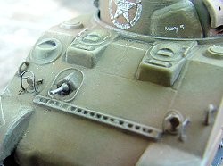 But after I put it together (which took about five minutes), I figured I would add some lift rings too, since they are such a prominent feature of Shermans. So, I put four lift rings onto the hull, and another three onto the turret. I simply used bent styrene rod to replicate them. But then I thought that the model really could use some headlights, so I added some from styrene. The lights looked pretty silly without their protective framework, so I added some from an Extratech etched brass set. And since I already added headlights, I might as well add tail lights too, which I then proceeded to do (along with their protective frames). Oh, yeah, and don't forget the bow machinegun and ball mount ...