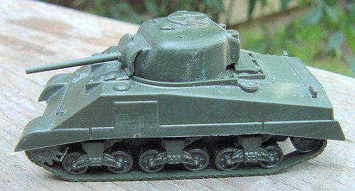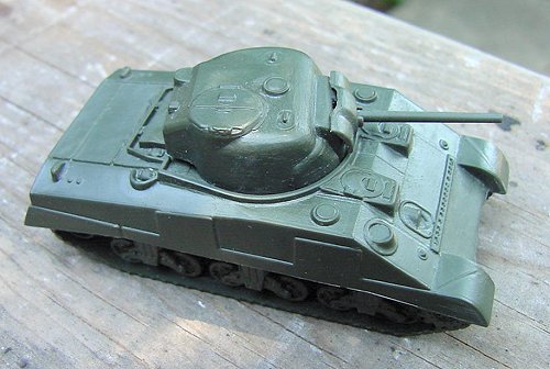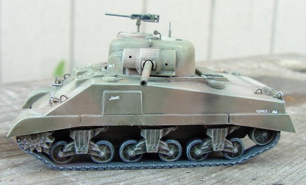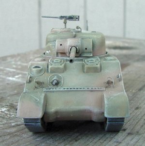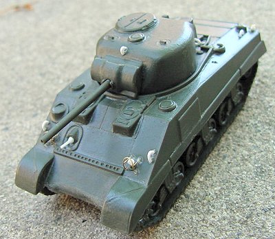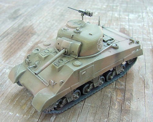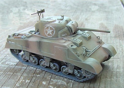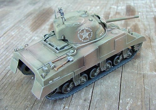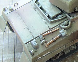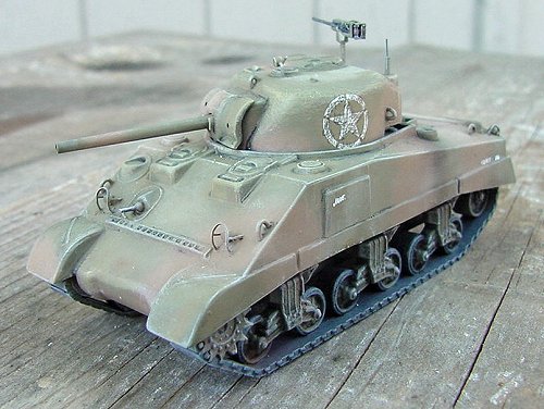 So that was pretty much all of the work that went into building the model. I decided to paint the tank as a member of 756th Tank Batallion in Italy, 1944, which had a neat camouflage scheme of tan and olive drab. Once I painted the tank, however, it looked a little bare, so I added a shovel and axe to the rear hull. The mounting brackets for these two tools were made from strips of lead foil that came wrapped around the top of a wine bottle.