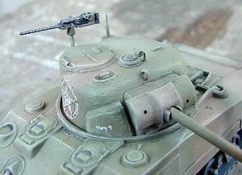 I thought I was finished, but the turret looked really plain, so I decided to add the small spotlight next to the roof ventilator, and also an antenna mount on the rear of the turret. That helped a lot, but it still needed a little lift, so I put together a .50 cal machinegun and mounted it behind the commander's hatch. It's a version of the gun with a perforated barrel, instead of the standard HB M2 version typically seen on US tanks, but I think it looks really cool. Although it's more appropriate mounted in an airplane, I've seen a handful of photos of this type of machinegun mounted on a Sherman, so it's not completely out of place (the gun is resin and etched metal from Aires).