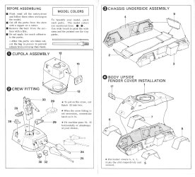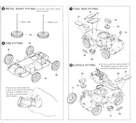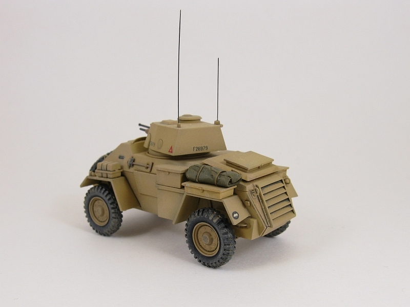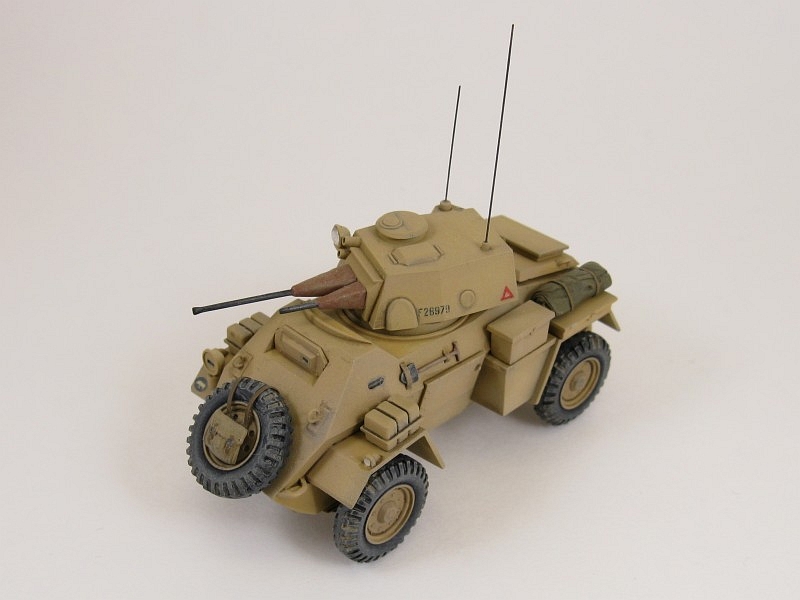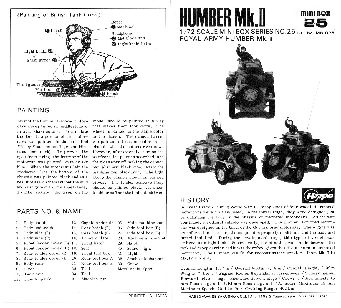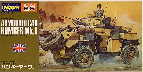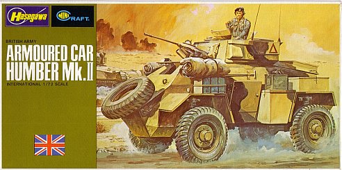 This Humber Mk.II is an old release of this vehicle by Hasegawa, probably molded in the 1970-1980 time frame. Inside the box you get a svelte count of 40 nicely molded parts in Hasegawa's excellent hard plastic. There are two short lengths of copper wire for the axles, a small decal sheet and an instruction sheet. Molded detail is very crisp. Flash was minimal, the only parts having any being the two tool boxes (parts 26 & 27). There were no sink marks of note except on back side of the wheels. Their position made them too difficlut to fill so they were left as is. You can't really see them once they're mounted on the axles anyway. The instructions are well laid out, easy to follow with no vagueness as to where parts are to be placed. One nice feature of the instructions is the naming of each part. I have always found naming the parts great because it also provided additional information about the vehicle and gave you a bit of an education along the way. The kit's two tarps are poorly molded with next to no detail or relief so they were assigned to the parts box and a replacement was fashioned from two part Tamiya epoxy with the addition of lead foil straps. I added lift rings to front and rear, handles to the engine cover and tow hooks to the front and rear. A scratch built shovel was attached to the left upper hull (an item that is sadly lacking and really should be included). The wheels are nicely detailed. Tire tread is very well done and as far as I can tell quite accurate. The search light was detailed with a chrome sequin for the reflector and 1-minute epoxy to represent the clear glass lens. I tried something new for the small lights on the fenders. These were drilled out, filled with gloss white paint and then filled with 1-minute epoxy to represent a clear lense. I think the end result shows enough promise to try this again on future builds. The main gun barrel and the smoke dischargers were drilled out. The cannon and machine gun can be glued in either of two positions: horizontal, or slightly elevated. The commander's hatch can also be molded shut, as I did, or cut in half to allow the figure to be inserted. Sections of guitar wire supplied the antennae. There is no suspension of any sort. Most of what I built was by guess and by golly because I couldn't find any clear photographs, only partial views of the Humber suspension. The few shots I did find show that the Humber definitely used a leaf spring suspension with a strut on the front. There are some exposed stearing components like tie rod ends and possibly an anti-sway bar on the front suspension but without a clear view of these I just settled for some springs attached to the axles along with the front strut. The leaf springs were liberated from a Hasegawa Jeep (got the Jeep for only a dollar at the local club's monthly raffle) and I added struts to the front from sections of plastic rod.