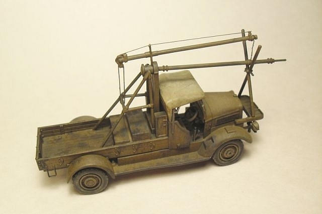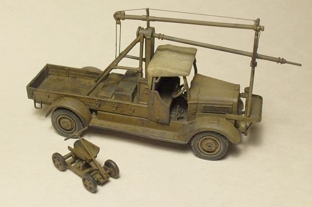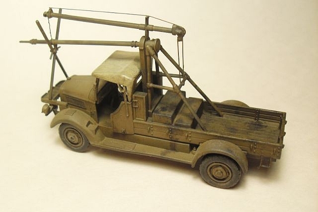 I then brush painted the canvas cab cover Tamiya XF-57 Buff and all eight tires (don't forget the cart) Vallejo 70862 Black Grey. After this dried, the entire model was washed using thinned Burt Umber oils. Oil and grease stains were added to the bed and sides of the truck using Burnt Umber, Black, and Burnt Sienna oils.