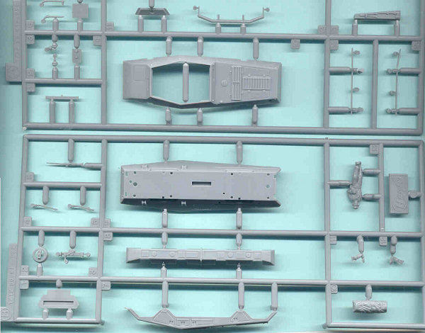 Here is Sprue B which is common to all four of Hasegawas 1/72-scale SdKfz 234 models. We have the upper and lower hull sections, the fenders with closed storage compartment doors and a rather mediocre crew figure at center right. AFTERMARKET DETAIL PARTS