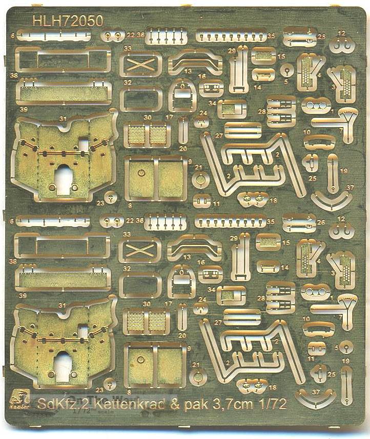 This PE set is meant for S-Model kit 720087 and as that kit contains two complete Kettenkräder and two Panzerabwehrkanonen, the set contain all hat is needed to cover them all. The set allows the modeler to improve almost all areas of the Kettenkrad, and even includes the small NSU plates (with readable inscription) to go on the front of the body. A small transparency is provided for the dashboard. The only thing that still seems necessary when upgrading the Kettenkrad is the front suspension as done on the third model here. Something that needs to be pointed out is that the PE handrails are completely open, which would not be correct for the S-Model kit, unless the modeler also increases the diameter of the holes in the roadwheels and turn the model into a proper M1 type (whereas the S-Model kit, out of the box, is an S1). For the Pak most of the parts will go into the shield and the protective plate to the side of the breech. In my opinion it would be nice if Hauler also released a set for S-Model 720080 (the stand-alone Kettenkrad) and 720088 (the Kettenkrad with the Püppchen), but for the time being, I'll be happy to try this set out on the set that it was designed for. |