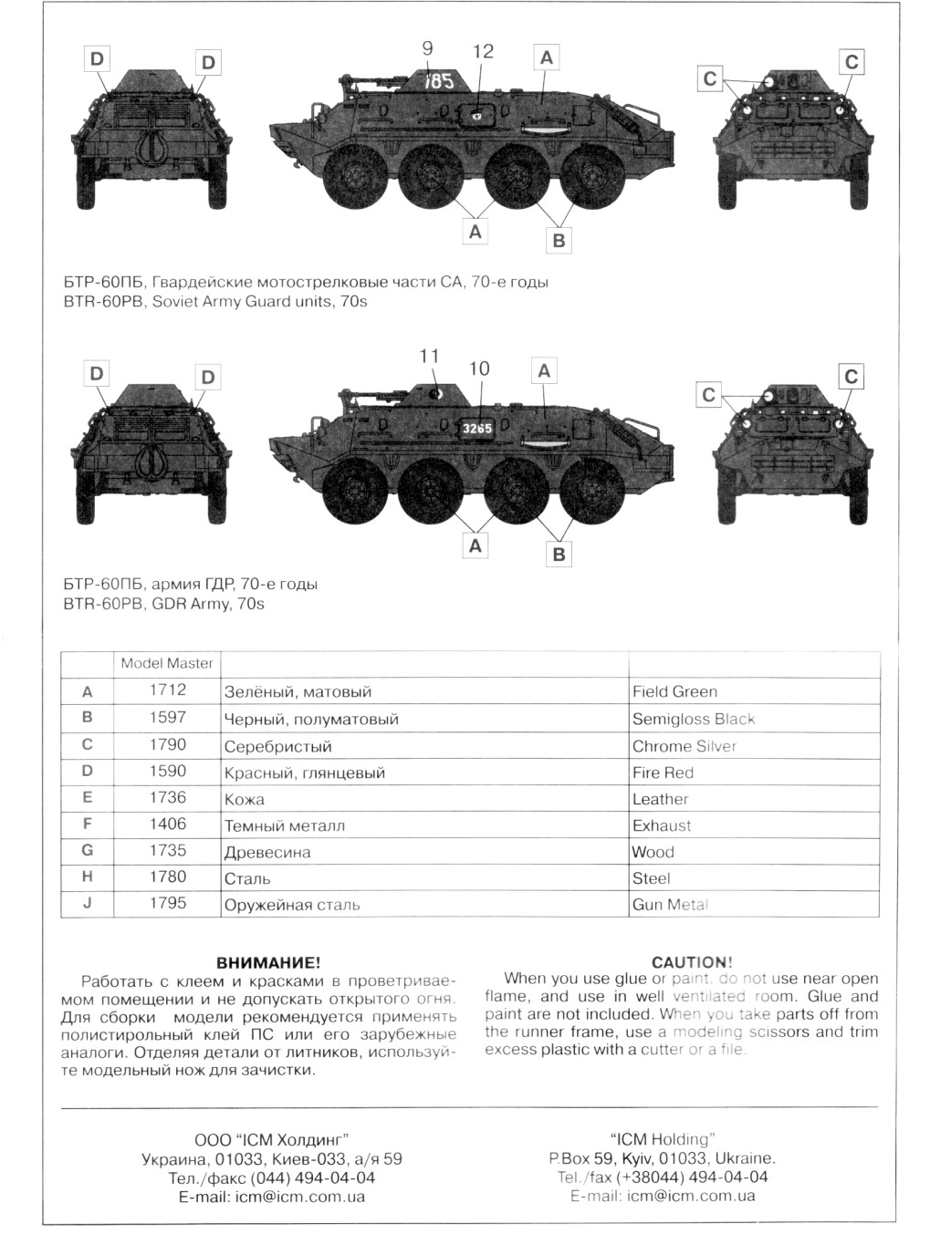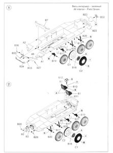 You get 102 parts in dark grey plastic and 16 wheel halves in black plastic, plus an instruction sheet and a decal sheet. This is a nice kit from ICM. I found that the kit went together quite well except for a few problem areas that may cause some frustration. The plastic is not too brittle but just enough to make things a bit tricky when it comes to removing the small parts from the tree. And there are lots of small and delicately molded parts. All of the grab handles, steps, pioneer tools and the rear stowage rack are very thin and nicely proportioned, but they are so fragile that you will probably snap most of them removing them from the tree, as happened to me. Many of the handles broke in half. Not wanting to try to make replacements with wire (I find it’s difficult to get them all the exact same shape and size) I resorted to gluing the broken handles on their respective spots, letting them set a few minutes and then pushing the broken ends together and gluing the join. Once dry a very delicate sanding with fine grade paper took care of the slight bump in the handle where the two parts meet. A bit more work than I was wanting but much less time consuming than trying to make replacements. The instructions are vague and bit busy so it’s easy to mount things in the wrong place. For example, I placed the front lights (part A11) a bit too low on the body. Placement of the suspension pieces is another area where the mount points are a bit vague. Some of the pioneer tools shattered into to many pieces and again I didn’t relish making replacements so they were not attached and I covered their mounting holes with bits of plastic to represent empty mounting straps. And I didn’t bother adding the tow cable. The cable portion is left up to the modeller to build from scratch. The cable is to attach to the hooks (part B9) which don’t have any sort of hole in which to insert the end of the cable. Again I didn’t feel like trying to route the cable onto the kit and potentially break some of the fragile grab handles that I had foolishly added first, so the tow cable also did not make it onto the model. Each tire is molded as two separate halves in black plastic with the wheel rims (part B18) being a separate piece that needs to be sandwiched between the halves. Unfortunately the holes in the tires are a fraction too small for the rim forcing you to open up the hole in each tire to allow the rims to be inserted. If the rims don’t go in easily, don’t try forcing them into the holes because it will cause the tire to split (trust me on this one). Opening up the holes is not too onerous a task, but if you’re not careful the centers may be slightly off (which happened to me on a few of the wheel assemblies), and you may encounter problems with getting all the wheels to touch the ground. What I did was test each wheel assembly and swapped them around to different axle positions to ensure that each would touch the ground before finally gluing them to the kit. I really disliked the black plastic for the tires. The dark colour made it difficult to see how well the rims seated to the tire sidewalls, so you’ll probably get a result similar to mine where the gap between the rim and the tire varies, being quite noticeable in places and non-existent in others. The mirror stalks (parts A22 & A23) are illustrated as being a tripod mount in the instructions but the actual part has only two legs, so the missing leg needs to be added from some stretched sprue or rod. You get a nice propeller (part B32), but if you follow the instructions and mount the covers (part B2 & B3) in the closed position the prop is covered completely. I didn’t bother putting the propeller on the model and it went into the parts box. The front window covers can be mounted in the open position but ICM does not supply clear window parts for the openings, leaving it up to the modeller to fashion these. I just glued the covers shut, as well as the other doors because there is no interior as such, other than a couple of seats, steering wheel and an instrument panel up front. These parts, along with the pieces for the gunner’s seat (A19, A20 & A21) went into the spares box. There are two marking options on the