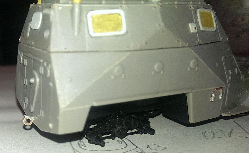 On the backside, I removed the shovel and crowbar and added a hatch. On the right upper corner there are lights that could benefit with some reworking : drill them out, paint them mirror and install lenses. The same procedure was done on the front road lights.