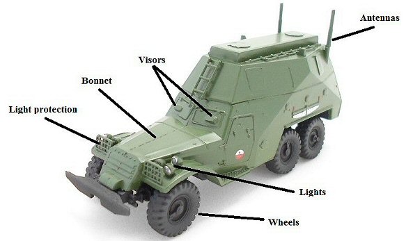 Parts, that “hit the eye” at first look, are bonnet, visors, light protection, lights, wheels and antennas. Bonnet and visors must be reworked, it is not so difficult, and other parts must be replaced.
