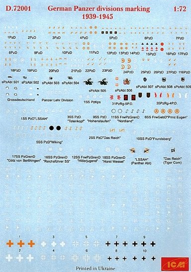 This new decal sheet (# D.72001) by ICM from Ukraine consists of emblems of German panzer troops plus a very extensive variety of tactical markings and a sortiment of balkenkreutzes from the time period 1939-1945. Both Heere (army) and Waffen-SS units are covered. With these decals it is possible to give the finishing touch to almost any German WWII tank or soft-skin vehicle according to one's personal wishes. Of course the modeller needs to acquire the identification numbers of unique vehicles elsewhere since they are not included on this sheet.