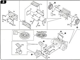 clear acetate style plastic for the windows, an equally small decal sheet and a 10 page instruction manual, with 6 build steps for the Tractor and 3 build steps for the