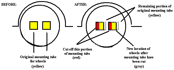 The only other major issue appeared during a test fit of the rear wheels. Here I discovered a problem concerning their location in the rear wheel well - they almost touched the front of the rear fenders. The cause was traced to the wheel hubs which have a pair of square shaped locators that are meant to fit onto a pair of square locating stubs on the end of the axles. This allows for a very sure fit when attaching the wheels but they also place the wheels too far forward in the well. My fix was to trim about half of the plastic from the front of the locating stubs on the axles. Doing this allowed me to shift the wheels about a millimetre or so to the aft, thus moving the wheels more to the middle of the wheel well. Not the most elegant solution but one that works (hopefully the crude diagram to the left provides a better idea of what I did to correct the wheels). |