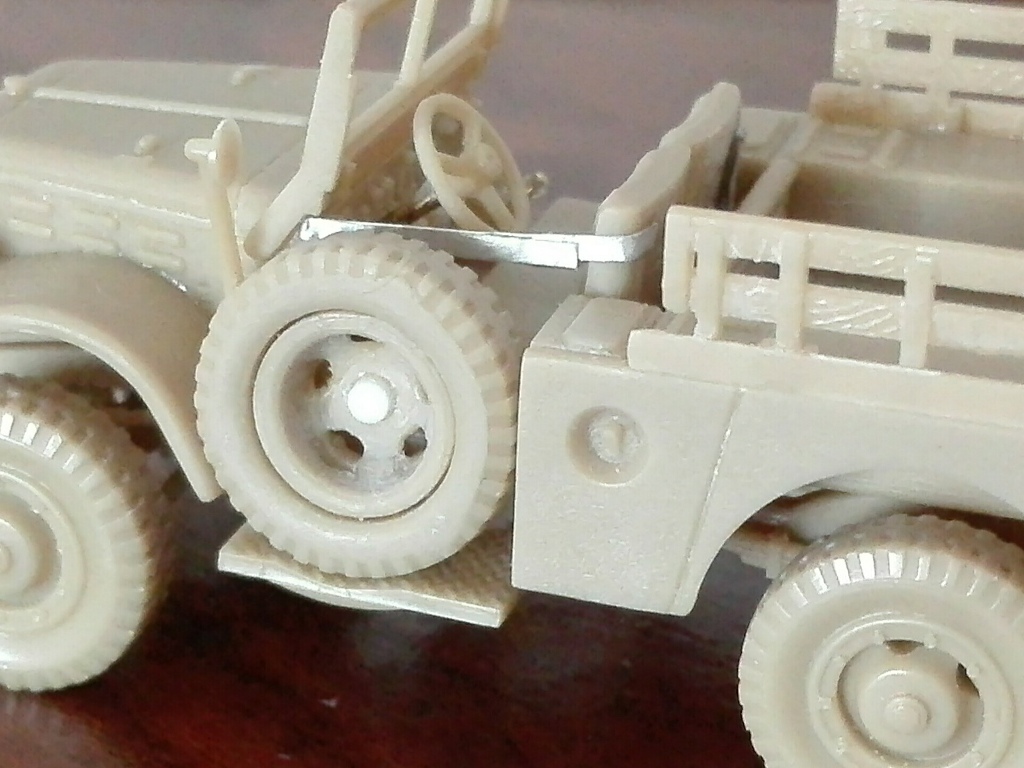 As correctly noted by other modellers, the model built out of the box sits high on its wheels. This is due to three facts. First, there are squared shims over the axles, which interlock in the leaf springs. Second, the shackles are a bit too high. Third, the rear bumpers hit the lower edge of the rear. To correct this, I made the following changes: