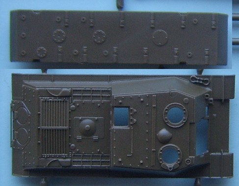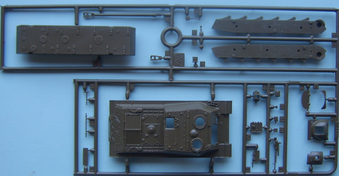 The Third release from Italeri using the IS chassis, this time it is the 122mm version and this time there is no simple version included. The kit uses the same hull as the ISU-152 kit with a new gun housing for the 122mm gun The main sprue contains the hull, gun mounts and hatches, suprisingly all the hatches are moulded open, (of sorts) although the drivers is moulded as an open space the visor is designed to be posed closed, but with a bit of effort could also be made open A closer look at the upper and lower hull the nose has some fine cast texture as has the gun mount The suspension is simplified in parts but is still a passable representation The only real problem lies with the half a shovel, although when compared to the Dragon Panthers half shovels the Italeri one is fully formed around the blade but is missing half the handle. The Track sprues are the same as used in the IS-2 and ISU-152 kits, the tracks are nicely detailed and the wheels are prehaps the best IS wheels in 1/72 having all the details but suffering slightly in depth.