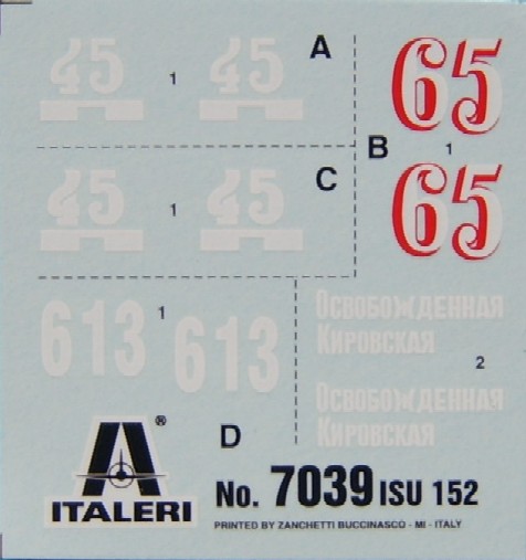 The second release from Italeri in the IS range, the kit is practically the same as the IS-2 with just the parts for the upper hull and gun changing, the lower hull and tracks are the same as the IS-2 kit, the gun for the IS-2 is included although it can not be used to build an ISU-122 without some modification to the gun mount. As before the kit includes a full "wargaming" easy build Kit, which unfortunately doesn't have the DshK for it, a spare one would have been very nice. These kits are not as highly engineered as the Dragon and to a certain extent the Trumpeter and Revell kits especially around the suspension, but that does not make then any less worthy and they build into nice pieces when made. The sprues include a new one for the upper hull of the ISU, all the crew access hatches are moulded open, the drivers visor is shut. The downside to this kit over the IS tank is that the barrel for the main gun is moulded in two halves producing a nice seam that needs to be removed, it would have been nicer if the barrel had been one piece and the muzzle brake in two halves, but I suppose it was done that way to keep costs down. Also included is a very nice DshK MG not as nice as the Trumpeter IS-3 one (which I think is the best one so far) it is still a good representation of the real thing. As already mentioned the lower hull is the same as on the IS-2 tank, not as refined as some of the other manufacturers releases, it is accurate in shape and layout. The road wheels are probably the best IS wheels in plastic. The Tracks are the same sprues as the IS-2 well detailed with enough to produce some sag ( I wish some other manufacturers would do the same) a close up of the wheels, tracks and sprockets can be found in the IS-2 Preview Decals are provided for 4 variants, although A and C look the same, Version C is for a 3 tone vehicle of green, brown and Sand, although so far I have only been able to find one reference of this scheme, on an IS-2
