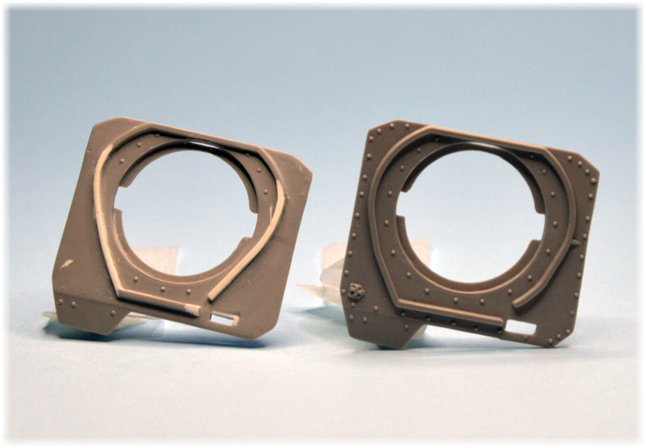 Since it is highly suggested to use the turret from kit 7517, the whole turret ring on piece 18B should be rebuilt to house the new turret, using a 0.5mm-thick square plastic rod. In the picture, the modified piece is on the left, the original one on the right. While doing this, try to save as much detail as possible, for example the antenna mount.