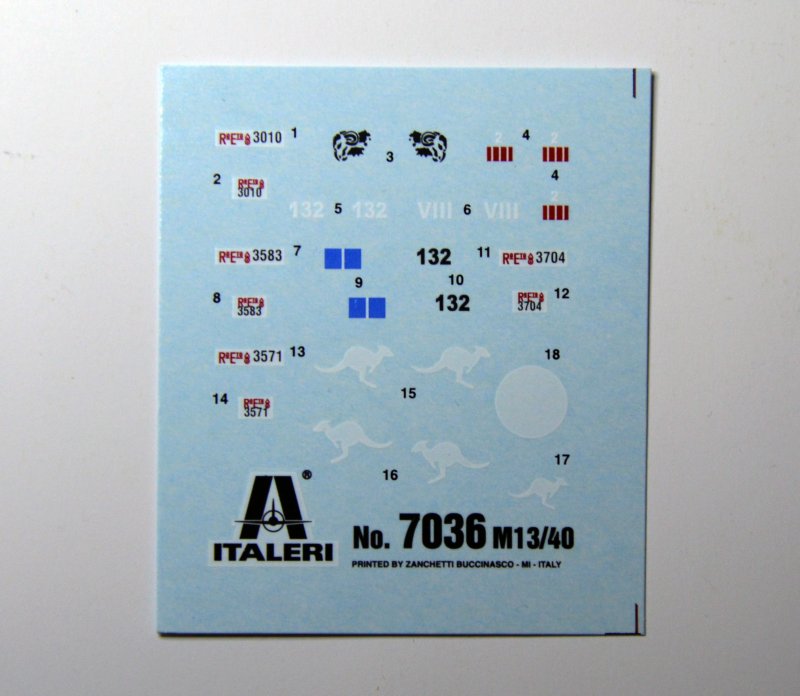 The kit gives the opportunity to build a command tank for batteries of Semovente da 75/18: those vehicles were produced on the chassis of M13/40, M14/41 and M15/42, starting from M13/40 3rd serie. The kit contains a circular plate to be mounted on the turret ring instead of the turret itself, but the piece is greyed out on Italeri instructions, meaning that it is not to be used. However, it could be a good starting point, provided that the 4-pieces-hatch is built from scratch, along with the two antennas. On the first batch of command vehicles (those on the M13/40 chassis) the original twin Breda 38 MG were maintained, while on the vehicles on the M14/41 chassis they were substituted with a single Breda 31 heavy machine gun. So, to build an accurate command tank, apart from scratching the hatch, either the tank is backdated to an M13/40 3rd serie, or the Breda 31 is scratchbuilt. ModellTrans produced quite an accurate conversion set (MT72301) which is now OOP.