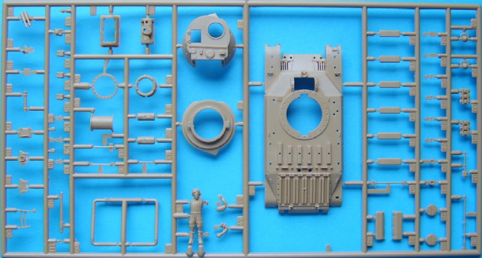 Another Italeri release of one of the old Esci Moulds. This along with the Valentine was one of the nicer releases from Esci. Having said that the kit is not without is's minor faults, but it is the only plastic one on the market The first sprue contains the upper hull and the turret plus most of the other attachments to be fitted. The hull is provided with the drivers hatch as a separate piece and is correct in shape and size, the front stowage bins have the louvered tops, although this is correct a lot of photo's show that a metal plate of some kind has been welded over the top, this was because with the louvers it was easy for the stowage to catch fire and become a danger to the crew, it also obscured vision to effectively reduce the fighting capability of the crew and tank. The turret comes with both hatches open and a separate commanders cupola also with open hatches although these are missing the small pistons mounted on the inside. There is a lot of stowage and boxes to be added to the outside of the turret including 2 smoke dischargers, which are marred by not being completely round and have the edge near the turret flattened, the ends could do with replacing to correct this. There is no turret interior provided like on the valentine kit, so if you wanted to build it with the hatches open you would either have to add the crew or part build the interior.