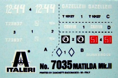 Decals are provided for 4 vehicles One Russian, two from North Africa 7th Armoured and 7 RTR and the one shown on the Box top N0.4 Independant troop Malta. All in all a nice kit that with a bit of loving care will build into a fine example, the kit measure out well to 1/72 scale according to the meager references I have for this vehicle. References Matilda Infantry Tank 1938-1945 by David fletcher Osprey new Vanguard NV008 |