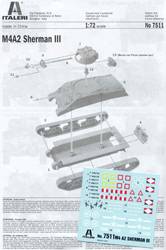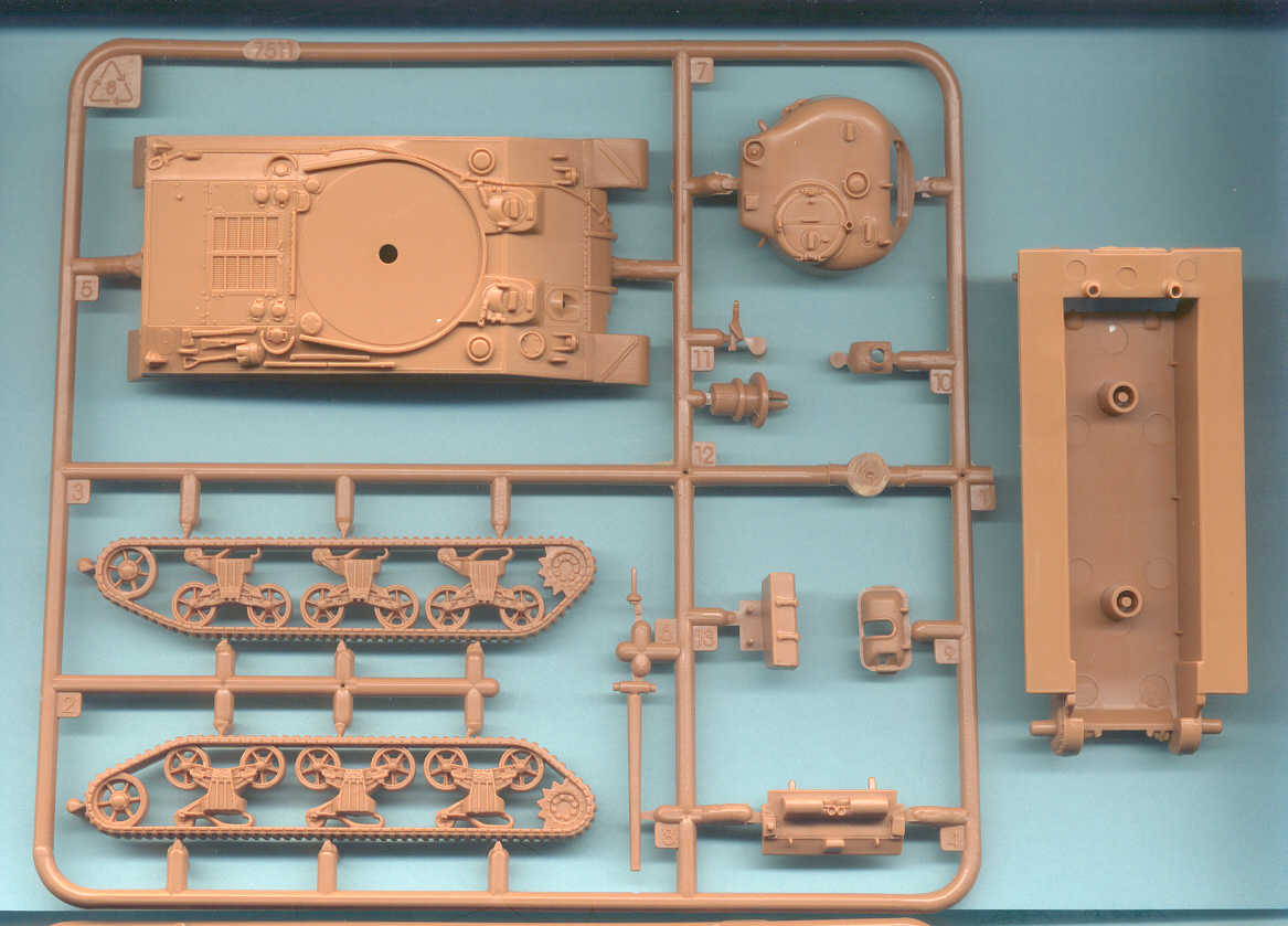 At top is the upper hull with molded on tools and an accurate engine deck for a diesel engine M4A2. At the bow are the two cast steel driver hoods with the small hatches and ventilation domes on either side. At the nose is depicted a three-piece bolted differential cover but lacking bolt detail due to the molding and assembly simplification. The side skirts are molded onto the upper hull. At upper right is the low bustle turret; along with on the hull, all crew hatches are molded shut. The rotor shield (gun mantlet) is the narrow M34 style. At lower right is the lower rear plate with a reasonably accurate pair of muffler and exhaust pipes for the diesel engines. At lower right is the optional storage box for the turret rear; this box is a British addition also used on M4s they supplied to Polish armored forces. At lower left are the two sets of one-piece