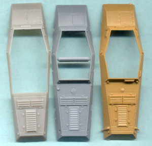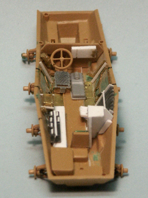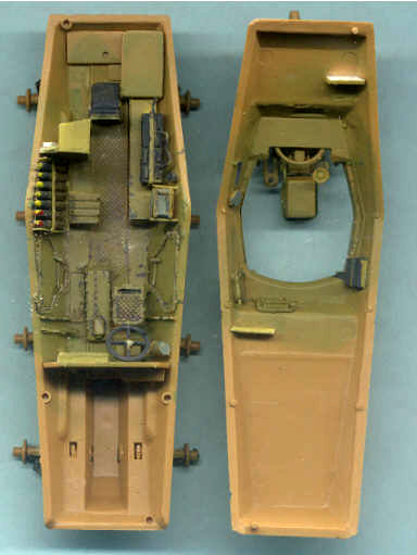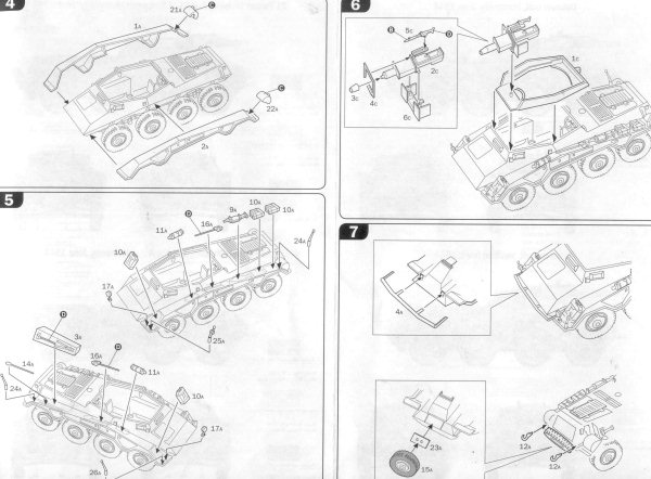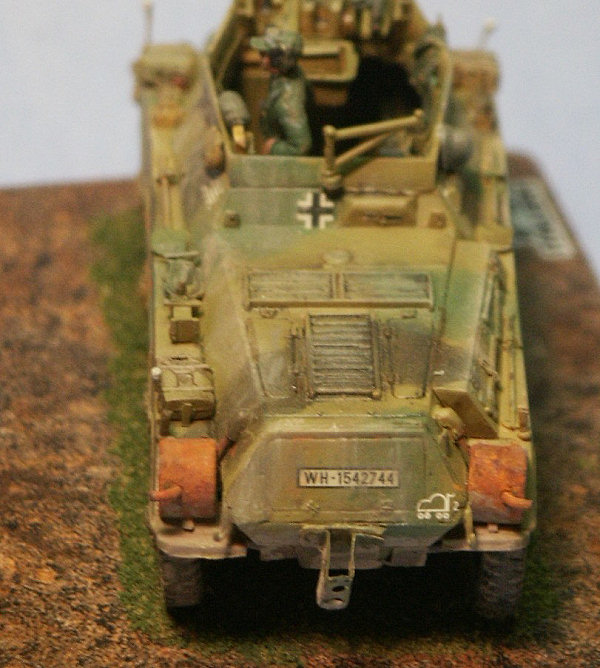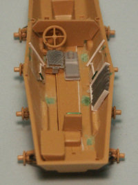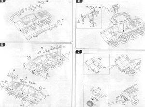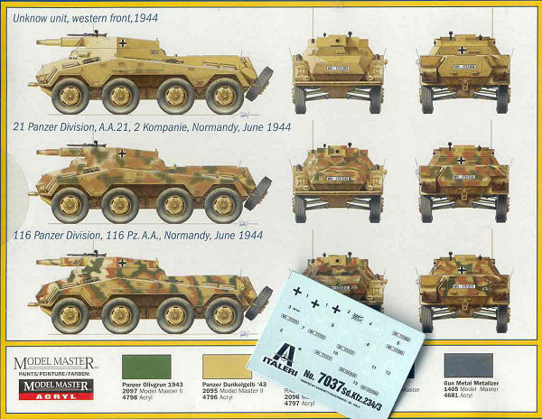I have long thought that we can learn much about a model kit from the box art. Here we have Italeris nice box art of their 1/72 scale support armored car, often times known as the Stummel due to the short 75-mm gun, the same main weapon as mounted in the SdKfz 251/9 and SdKfz 250/8 halftracks. Italeris depiction shows a vehicle finished in overall dark yellow (Dunkelgelb RAL 7028) color. We see a light sheen to the rubber tires contrasting with the more flat vehicle paint. The paint finish appears streaked with dust running down the sides. In addition to the exterior stowage we can see inside through the open exterior the main gun breach and what appears to be an ammunition storage box. On the back of the box Italeri gives us three 3-view color paintings for Heer (German Army) vehicles in France, the color guide is nice but the choice in markings are disappointing to me and other modelers who focus on the Eastern Front. Italeris decals cover the three vehicles in the color guide. This is a comparison of Italeris SdKfz 234 upper hull (in tan styrene @ far right) with the Hasegawas gray styrene hull in the center and Rodens light gray upper hull at far left. Rodens hull is a tad longer and all the hulls appear slightly different in rendition of some fittings and parts such as the engine deck louvers. Italeri gives us exhaust pipes molded on which, for a good display model, would be good to replace with heavy gage wire. All three kits will benefit from etched brass detail and replacement parts. Italeris tan styrene fender at top is similar in quality and proportions to Hasegawas fender immediately below it. Rodens fenders at the very bottom are slightly longer than the others. Roden gives us a wonderful option of having open storage bins. Like their other parts Italeri molds their fender parts very well with few to no flash or sinkholes throughout the kit. Like other parts Italeris and Hasegawas parts have overall better rendered detail than Rodens. From left to right here we have a side-by-side comparison of Hasegawas SdKfz 234 roadwheels with separate hubs, then Italeris in tan, Rodens two-part black styrene roadwheels, and Attacks resin Puma Wheel Set for the Hasegawa 234 kits. Rodens roadwheels appear slightly smaller than the others. Ive found that Attacks great roadwheels can also be easily modified to use on Rodens SdKfz 234 kit. All the styrene plastic wheels have a problem in missing tread detail on their surface; hence the Attack superbly detailed resin replacement wheels. The backside of Attacks wheels at left show the attachment points where the wheels attach to Hasegawas SdKfz 234 suspension arms. Attacks major drawback is that the way the attachment points are oriented, the flat spot without tire tread where the resin poring stub is will always be visible. Attack should have oriented the wheels so their pour stub spot was on the bottom! With some work these wheels can be modified to fit on the Italeri model. Italeris instructions are pretty clear and simple exploded-view type reflecting the few parts and the simple assembly. Italeri gives us a choice of quick Wargaming assembly with simple rod axles, or display model assembly with the more complicated independent axles and suspension shown in the photo below. Here we have a comparison of the lower hulls and suspension of the Hasegawa SdKfz 234 kit (far left in gray), the Italeri kit in the center, and the Roden kit at far right. I found Italeris suspension to be more complicated to assemble than Hasegawas and had a bothersome gap on the bottom that was filled with green model putty. Italeris wheels attach on posts making it difficult to turn the wheels and to use Attacks aftermarket resin wheels. (BTW, if Rodens suspension looks uneven, that is because the suspension arms were modified so the wheels can be articulated over uneven ground. Since a significant part of the SdKfz 234/3 interior is visible it will need some accurate scratchbuilding as well as a few etched brass parts to get accurate for a display model. At right is how bare the interior would be without many new, additional parts. Some of Italeris interior parts like storage boxes are inaccurate, and things like the fore and aft driver seats are greatly simplefied. A seat back has been taken from a Dragon SdKfz 251 kit; a transmission or drive train piece (the gray box next to the rear divers seat) was cut from a Hasegawa SdKfz 234 kit; the frame for the side escape doors are etched brass; storage boxes and the ammunition ready rack are scratchbuilt. The Italeri rendition of the 7.5-cm K51 gun and upper superstructure is pretty basic and needs some detailing and corrections. The recoil guard received a support frame of copper wire and the front armored plate received some bolts made from copper wire. The interior of the superstructure has a narrow storage bin along its length I fashioned from sheet aluminum. The interior will need to be completed, painted and weathered before the upper and lower hull sections are glued together. Here we see the fore and aft driver locations, ammunition stowage, and underside of the gun mounted on the roof of the upper hull. Good references for the interior of this vehicle were rare for me and my interior is therefore a compilation of details from a half dozen museum shots, historical photos and trusted well-detailed models by respected modelers. The interior was painted all dark yellow, parts like the batteries and ammunition were painted appropriate colors, then a point-wash was applied and all was weathered. Now ready for painting many of the modifications and scratchbuilt pieces can be seen. The attachment points for the wheels are visible. Ta Daaa: the completed model! Colors chosen were a basic three-color sprayed on scheme, though rather than the typical German Rotbraun I opted for a darker brown. Over the Dunkelgelb color a point wash of dark brown and black was applied in recesses and around bolts. The markings are Italeris 