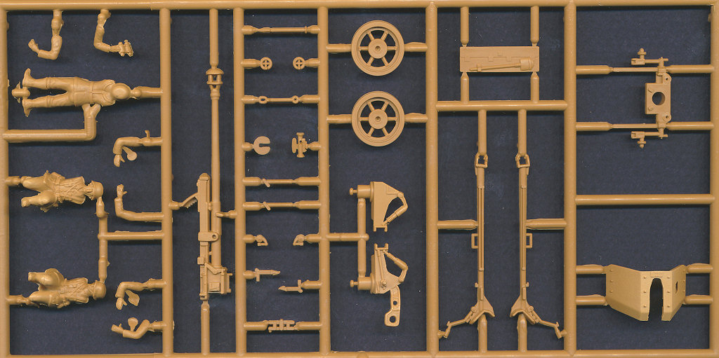 The main vehicle parts will look familiar to anyone with the other Italeri Sd.Kfz. 234 kits, as it is mostly the same. The primary difference with these parts is the upper hull, which has been modified to accomodate the PaK 40. Interior detail is sparse, and limited to only some bulkheads, storage boxes, and very poor driver's seats. Although the gun will block much of the interior view once mounted in place, there will still be a bit visible, so I think some effort will be required here to correct and improve upon the interior. Luckily, there is a photoetched detail set available from PART that includes many parts that will greatly improve this kit. Exterior hull details are basic, but not bad. Some pioneer tools are molded as separate parts, which is good, and others are molded in poor relief on the hull parts, which is not good. The small tie-downs molded onto the hull corners should be carved off and replaced, though the armored viewport covers look pretty good, assuming you want them closed. The exhaust pipes should be carved off and replaced, and the mufflers could stand to be improved a bit by the modeler as well. As with the other Italeri kits, optional parts are included to make a simplified chassis with workable wheels for those who want a quick build toy. The standard chassis parts are fairly well done and look good when built, though they lack some smaller suspension details seen in other kits. The wheels are nicely done, probably as good as possible for plastic parts, but for best results they should be replaced by resin aftermarket wheels, several designs of which are available. For those of you familiar with the old ESCI kits, this sprue may look familiar to you, as it is the PaK 40 that is included with the ESCI (now Italeri) German Guns Set. This of course means that it is pretty bad. While the detail on the gun is nothing special, the real drawback is the fact that for some inexplicable reason, the gun is molded in the recoil position, as though it is caught in the act of firing. Perhaps if you want to build a diorama depicting it thusly, this gun may not be too bad. But even so, if you can afford to buy a replacement gun, that would work best. Right now, the only PaK 40 sold as a separate kit is from Roden, which is pretty good. Other potential replacement guns can be obtained from other kits. By the way, the figures included here are poorly detailed, and in no way will fit within the confines of the kit's fighting compartment.
