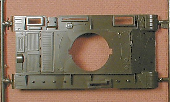 Even though the box art shows the loaders hatch open, the hatches are all molded closed. The vision blocks are all solid but to be fair; they are also very small. The mantlet has a hint of fabric texture on it but I plan to use paper to replicate the cover that seals the gun to the turret. The sight on the left side of the main gun is represented but the machine gun on the right is missing. On close inspection, the details on the hull and turret are simplified and are represented by geometric shapes; but they are crisply molded. There is a shovel molded onto a fender but no other tools. There is no tow cable or headlight guards provided.