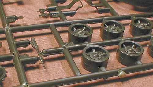 The road wheels are one piece and really need to have a grove cut down the middle because their large size wont be hidden by the tracks.