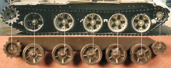 One of the most prominent features of Russian tanks is the varied spacing of the road wheels. I checked this spacing by comparing a profile photograph (thanks to ArmorFoto) with the kit hull side and wheels. The last four wheels seem to be a little too far back. The relative spacing is about right and when comparing the left and right side; they are offset as they should be by about a millimeter.