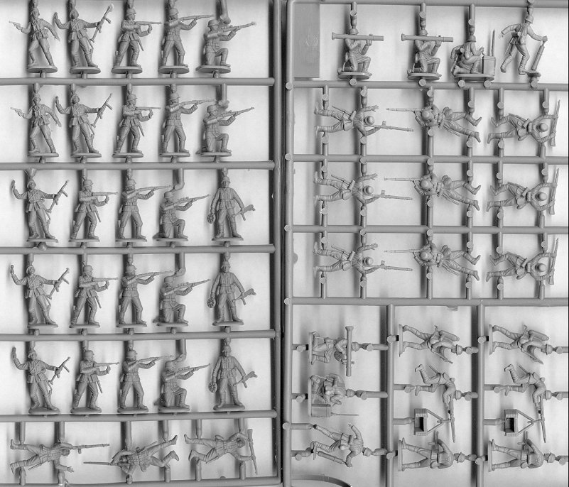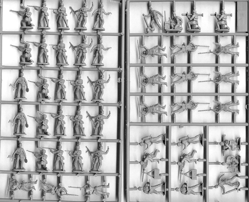 These are essentially the same figures as were originally released by ESCI, but with a couple of improvements. First, the molds have been cleaned up considerably, so the molding quality is much improved, with no flash, and very minor molding seams along the edges of the figures. Second, the plastic that Italeri is using is much more firm than the really soft, flexible, vinyl-like plastic ESCI used. The new stuff is not quite as hard as the styrene used for the AFV kits, but its increased rigidity makes it easier to cut and trim the figures. I have not yet tried gluing any parts, so I don't yet know if this stuff glues any easier.