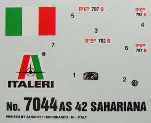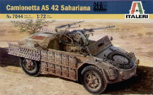 What better for an Italian company to release other than an Italian subject, albeit WWII, with the re-release of the old Esci Italian vehicle kits, Italeri are now expanding on that range with a few new vehicles of their own. Released after the two Esci tanks comes the AS 42 Sahariana, this small vehicle designed for the desert, based on the chassis of the AB 41 (which is also to be released) designed to be run both forwards and backwards this 4 wheel drive vehicle was built for reconnaisance work for the Italian army in North Africa. After the fall of the Italian army in North Africa the vehicle was redeployed to Italy where it still served with the Police force until the 1950's. The kit comes on one complete sprue,(shown here from both sides) the kit is quite simple in it's construction, but nether the less it is also nicely detailed. All the extra jerrycans for fuel and water for fitting down the side of the vehicle are supplied, but there are those that might wish to replace them as they are not the correct sort for the italian army. The 20mm Breda cannon is nicely represented as is the mount, also included is a MG. Two types of windscreen are included one with a protective cover and one open, the kit supplies the clear acetate for the windows with the instructions giving the correct dimensions for the acetate to be cut for both types of windscreen. Decals are included for 2 vehicles both from Tunisia in 1943, the Italian flag for over the rear engine used as an aid to recognition will need a lot of softener for it to settle down over the detail there, the more adventurous might want to paint it on. The decals are thin and in register. A small square of acetate is supplied for the windows, the dimensions of which are given in the instructions. This is a nice simple kit of a rare vehicle,Although the vehicle was used by the German Fallschirmjaeger both in Italy and on the Eastern front no markings are supplied for these, which is a shame. References on this vehicle are limited to general Italian vehicles books. |