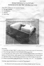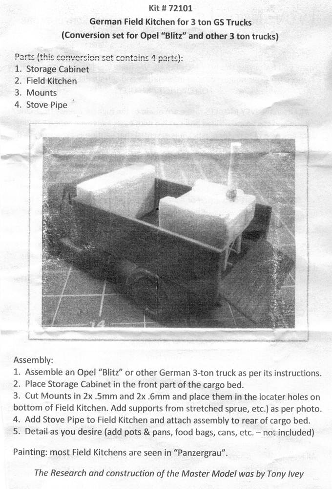 References http://www.onthewaymodels.com/gallery3/TIvey_Ivey_Opel.htm http://www.2ndpanzerdivision.com/field_kitchen.htm Additional reference photos, including ones with views of this field kitchen mounted in a 3-ton truck can be found on line with a good web search. |